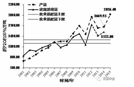 圖1  2001年-2015年磷肥產(chǎn)量及表觀消費(fèi)量