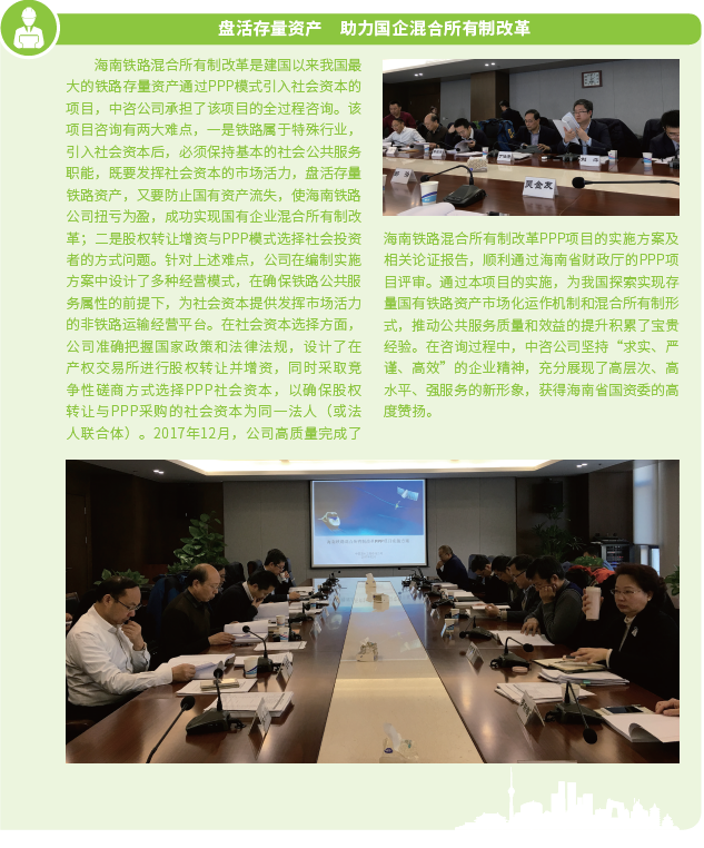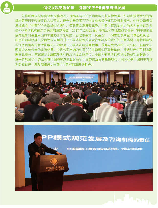 2016年以來,中咨公司緊緊圍繞“12445”發(fā)展戰(zhàn)略構想,鞏固提升五大業(yè)務支撐體系,積極探索開展政府和社會資本合作(以下簡稱PPP)咨詢等投資策劃業(yè)務,建立投融資平臺,尋找有價值的投資機會,實現(xiàn)資本與智本的融合,構建智力服務新業(yè)態(tài),拓寬工程咨詢服務價值鏈。