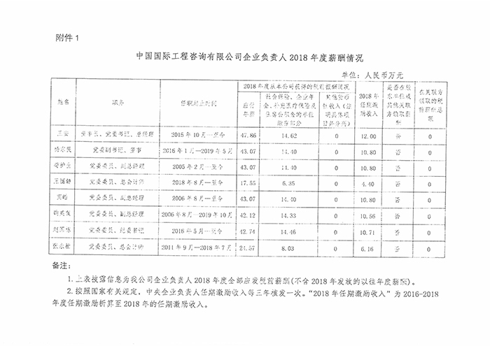 中國國際工程咨詢有限公司企業(yè)負(fù)責(zé)人2018年度薪酬情況披露