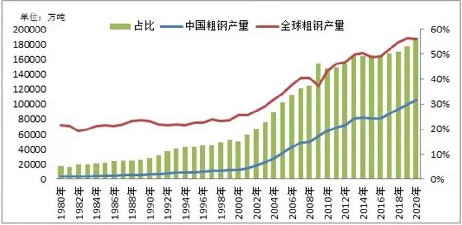 圖1 1980-2020年中國(guó)與世界粗鋼產(chǎn)量及其占比