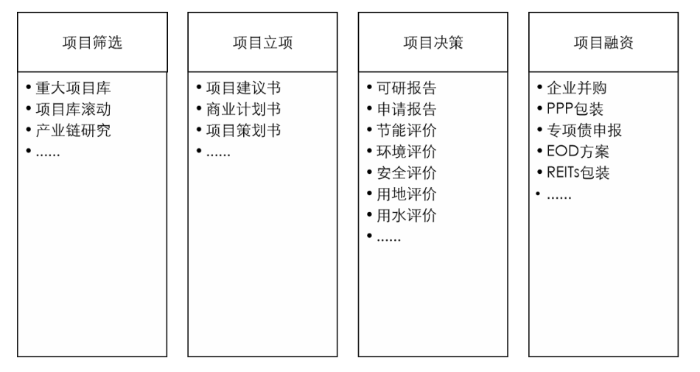 在各地項目謀劃實踐中,項目謀劃有狹義與廣義兩種范疇。所謂狹義的項目謀劃,是為配合發(fā)展規(guī)劃、區(qū)域規(guī)劃或專項規(guī)劃的落地實施,提高規(guī)劃的針對性和操作性,研究提出未來一段時間部署實施的重大項目安排,包括篩選項目、提出重大項目入庫清單,以及根據新形勢新變化新要求,動態(tài)優(yōu)化調整重大項目庫。所謂廣義的項目謀劃,則覆蓋了整個項目前期階段,包括研究重大項目總體安排、開展重點項目前期研究等任務。本文探討廣義的項目謀劃,包括階段劃分和主要工作。 一、項目謀劃的階段劃分 基于全過程管理理念,世界銀行、亞洲開發(fā)銀行等國際金融組織通常將項目周期劃分為“項目提出與篩選、項目前期研究、項目評估與決策、項目建設實施、項目運營及后評價”五個階段。借鑒國際項目管理經驗,國內將“項目提出與篩選、項目前期研究、項目評估與決策”三個階段納入項目前期管理工作,同時建立和強化了項目中期監(jiān)督管理和后評價制度。 項目謀劃覆蓋整個項目前期,可劃分為“項目篩選、項目立項、項目決策和項目融資”四個階段,這是項目研究逐步深入、認識不斷深化、質量漸次提高、成果優(yōu)化完善的過程,涉及投資機會研究、項目初步可研和可行性研究,項目儲備、包裝、申報,包括企業(yè)并購、專項債、PPP、EOD和REITs方案等具體工作。 圖1 項目周期 圖2 項目謀劃的主要階段 二、項目謀劃的主要工作 (一)項目篩選階段 項目篩選階段的主要工作是研究提出重大項目清單,并根據形勢變化進行優(yōu)化調整,以及開展重點產業(yè)鏈創(chuàng)新研究,提出產業(yè)鏈、產業(yè)空間布局圖、企業(yè)分工協(xié)作鏈等。 ——研究提出重大項目清單。近年來,各地在開展國民經濟和社會發(fā)展五年規(guī)劃、產業(yè)發(fā)展和區(qū)域發(fā)展等中長期規(guī)劃時,為了提高規(guī)劃的針對性、指導性和可操作性,都以重大項目為抓手,優(yōu)先保障土地、能源等要素資源,研究提出未來一段時期的重大項目建設安排,并在資金財政、金融信貸等方面予以支持。本階段項目謀劃的主要工作是分析發(fā)展基礎,查找問題短板,把握政策規(guī)劃,跟蹤行業(yè)動向,研究市場需求,征求篩選提出重大項目清單,納入各地發(fā)改委重大項目庫管理。各地在推薦申報中央和地方財政預算各類專項時,一般也會將項目入庫作為前置條件。 ——動態(tài)優(yōu)化調整項目清單。由于中長期規(guī)劃執(zhí)行期通常都在3-5年或是5-10年,有的甚至長達10-15年。在此期間,市場、技術、政策、規(guī)劃、環(huán)境、資源等都可能發(fā)生變化,甚至出現重大變化。比如2020年開始持續(xù)三年的全球新冠疫情、美國主導的逆全球化和我國構建“以國內大循環(huán)為主體、國內國際雙循環(huán)相互促進”新發(fā)展格局、全面建設社會主義現代化國家。面對新階段新形勢新任務,各地在開展“十四五”規(guī)劃中期評估中,都會重新審視規(guī)劃目標、指標和主要任務,以及重大項目安排,并對規(guī)劃進行修編,對重大項目安排進行調整、補充、完善。 ——重點產業(yè)鏈創(chuàng)新研究。開展產業(yè)鏈創(chuàng)新研究,從中尋找關鍵薄弱環(huán)節(jié),提出“延鏈、補鏈、強鏈”重大項目,建立產業(yè)鏈推進鏈長制,強力推動產業(yè)集聚集群發(fā)展,是各地項目謀劃的創(chuàng)新模式。產業(yè)鏈作為暢通國民經濟循環(huán)的橋梁和紐帶,在構建雙循環(huán)新發(fā)展格局中的作用至關重要。通過產業(yè)鏈創(chuàng)新研究,聚焦龍頭企業(yè)不強、產業(yè)鏈條不完善、整體產業(yè)規(guī)模待提升等問題,以構建全產業(yè)鏈生態(tài)、增強產業(yè)安全韌性為目標,加快促進產業(yè)鏈上下游、產供銷、大中小企業(yè)協(xié)同發(fā)展,暢通產業(yè)循環(huán)、市場循環(huán)、經濟社會循環(huán),推動產業(yè)高質量發(fā)展。 (二)項目立項階段 項目立項階段的主要工作是預可行性研究,編制項目預可行性研究報告、商業(yè)計劃書、項目策劃書等。 ——預可行性研究。又稱初步可行性研究、項目建議書或立項申請報告。由項目發(fā)起人(籌建單位或項目法人)根據國家和地方中長期規(guī)劃、產業(yè)政策、生產力布局、國內外市場、所在地的內外部條件,就某一新建、擴建或改造項目提出的項目建議文件,是對擬建項目的框架性的總體設想。重點論述項目建設的必要性,把項目投資的設想變?yōu)楦怕缘耐顿Y建議。按照國內投資項目管理制度規(guī)定,項目建議書是項目發(fā)起人向政府投資主管部門上報以獲得項目立項的申報文件,為項目審批機關作出初步決策提供必要依據。項目建議書也是大型、復雜投資項目前期研究不可或缺的重要環(huán)節(jié),可以減少項目選擇的盲目性,為下一步可行性研究打下基礎。 ——編制商業(yè)計劃書。商業(yè)計劃書是項目單位為獲得招商融資和其它發(fā)展目標,根據一定的格式和內容要求,向受眾全面展示公司和項目狀況、發(fā)展計劃和未來潛力的報告。主要意圖是給投資者提供一份創(chuàng)業(yè)的項目介紹,展現創(chuàng)業(yè)項目的潛力和價值,便于投資者準確評判企業(yè)或項目,并說服他們對項目進行投資,從而使企業(yè)獲得融資