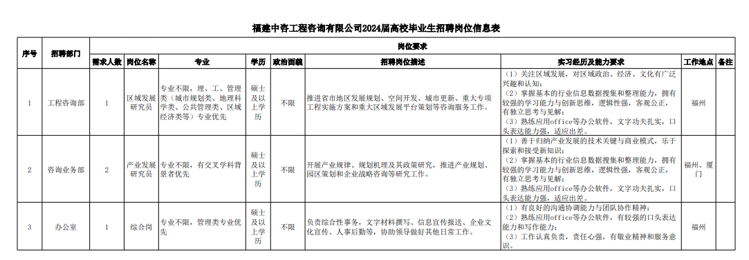 (一)基本條件:遵紀守法、品行端正、身體健康、無不良記錄;認同和遵循中咨公司的企業(yè)文化,具有較強的事業(yè)心和責任感,具備良好的職業(yè)素養(yǎng),作風嚴謹、正派,有良好的團隊合作精神和組織協(xié)調與溝通能力;為人誠信、工作勤奮、學習能力強,具有創(chuàng)新精神;