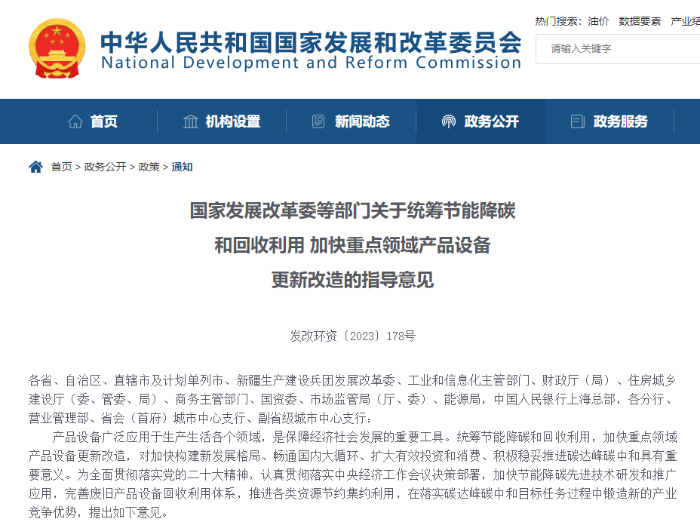 擴(kuò)大產(chǎn)品設(shè)備更新改造有效需求 推動(dòng)制造業(yè)高品質(zhì)供給 助力實(shí)體經(jīng)濟(jì)高質(zhì)量發(fā)展 ——《關(guān)于統(tǒng)籌節(jié)能降碳和回收利用 加快重點(diǎn)領(lǐng)域產(chǎn)品設(shè)備更新改造的指導(dǎo)意見(jiàn)》解讀 中國(guó)國(guó)際工程咨詢有限公司 潘小海 產(chǎn)品設(shè)備作為日常生產(chǎn)生活中不可或缺的工具,是保障經(jīng)濟(jì)社會(huì)發(fā)展的重要基礎(chǔ),具有應(yīng)用范圍廣、保有量大、能耗量高、再生資源蘊(yùn)藏豐富等特點(diǎn)。近日,國(guó)家發(fā)展改革委等9部門聯(lián)合印發(fā)了《關(guān)于統(tǒng)籌節(jié)能降碳和回收利用 加快重點(diǎn)領(lǐng)域產(chǎn)品設(shè)備更新改造的指導(dǎo)意見(jiàn)》(發(fā)改環(huán)資〔2023〕178號(hào),以下簡(jiǎn)稱《指導(dǎo)意見(jiàn)》),對(duì)相關(guān)工作進(jìn)行部署,明確了總體要求、工作目標(biāo)和重點(diǎn)任務(wù),有利于暢通國(guó)內(nèi)大循環(huán)、加快發(fā)展方式綠色轉(zhuǎn)型、積極穩(wěn)妥推進(jìn)碳達(dá)峰碳中和、助推經(jīng)濟(jì)社會(huì)高質(zhì)量發(fā)展。 01 加快產(chǎn)品設(shè)備更新改造和回收利用是暢通國(guó)內(nèi)大循環(huán)的重要手段 加快構(gòu)建以國(guó)內(nèi)大循環(huán)為主體、國(guó)內(nèi)國(guó)際雙循環(huán)相互促進(jìn)的新發(fā)展格局,是以習(xí)近平同志為核心的黨中央作出的重大戰(zhàn)略決策。去年底召開(kāi)的中央經(jīng)濟(jì)工作會(huì)議將著力擴(kuò)大內(nèi)需放在2023年重點(diǎn)工作任務(wù)首位。近期,習(xí)近平總書(shū)記在中央政治局第二次集體學(xué)習(xí)時(shí)強(qiáng)調(diào),要搞好統(tǒng)籌擴(kuò)大內(nèi)需和深化供給側(cè)結(jié)構(gòu)性改革,形成需求牽引供給、供給創(chuàng)造需求的更高水平動(dòng)態(tài)平衡,實(shí)現(xiàn)國(guó)民經(jīng)濟(jì)良性循環(huán)。 從經(jīng)濟(jì)發(fā)展規(guī)律來(lái)看,大國(guó)經(jīng)濟(jì)具有內(nèi)需為主導(dǎo)的顯著特征。我國(guó)市場(chǎng)上的產(chǎn)品設(shè)備種類多、應(yīng)用范圍廣,對(duì)促進(jìn)國(guó)內(nèi)消費(fèi)、帶動(dòng)經(jīng)濟(jì)增長(zhǎng)具有重要作用,是實(shí)施擴(kuò)大內(nèi)需戰(zhàn)略的重要著力點(diǎn)。僅以家用電器為例,有關(guān)行業(yè)協(xié)會(huì)數(shù)據(jù)顯示,我國(guó)主要家用電器保有量已超過(guò)20億臺(tái),2021年家用電器市場(chǎng)規(guī)模達(dá)8811億元,家用電器行業(yè)規(guī)模以上企業(yè)營(yíng)業(yè)收入1.7萬(wàn)億元。 《指導(dǎo)意見(jiàn)》首批聚焦鍋爐、電機(jī)、電力變壓器、制冷、照明、家用電器等6類產(chǎn)品設(shè)備,多措并舉支持企業(yè)開(kāi)展更新改造,推動(dòng)淘汰低效落后產(chǎn)品設(shè)備,加強(qiáng)節(jié)能降碳先進(jìn)技術(shù)推廣應(yīng)用,完善廢舊產(chǎn)品設(shè)備回收利用體系。相關(guān)舉措有助于發(fā)揮我國(guó)超大規(guī)模市場(chǎng)優(yōu)勢(shì),孕育不同領(lǐng)域、不同層次、不同群體對(duì)高效節(jié)能產(chǎn)品設(shè)備的有效需求,帶動(dòng)設(shè)計(jì)、生產(chǎn)、應(yīng)用、回收、處置全鏈條發(fā)展,帶動(dòng)產(chǎn)業(yè)投資,增加就業(yè)崗位,進(jìn)一步激發(fā)國(guó)內(nèi)市場(chǎng)巨大活力。 暢通國(guó)內(nèi)大循環(huán)離不開(kāi)需求側(cè)消費(fèi)牽引,也需要供給側(cè)提質(zhì)升級(jí)。《指導(dǎo)意見(jiàn)》緊緊扭住深化供給側(cè)結(jié)構(gòu)性改革這條主線,提出發(fā)展一批高效節(jié)能產(chǎn)品設(shè)備生產(chǎn)骨干優(yōu)勢(shì)企業(yè)及生產(chǎn)制造集聚區(qū),通過(guò)強(qiáng)化財(cái)政、稅收、金融等政策支持,引導(dǎo)企業(yè)優(yōu)化產(chǎn)品結(jié)構(gòu),提升高效節(jié)能產(chǎn)品設(shè)備市場(chǎng)供給,筑牢產(chǎn)品設(shè)備消費(fèi)升級(jí)基礎(chǔ)。相關(guān)舉措將推動(dòng)產(chǎn)品設(shè)備供需兩側(cè)有機(jī)結(jié)合,以高效節(jié)能產(chǎn)品的消費(fèi)需求倒逼供給,以高品質(zhì)供給驅(qū)動(dòng)消費(fèi)需求,形成供需良性循環(huán)和動(dòng)態(tài)平衡。 02 加快產(chǎn)品設(shè)備更新改造和回收利用是積極穩(wěn)妥推進(jìn)碳達(dá)峰碳中和的必然選擇 節(jié)能是最直接、最有效、最經(jīng)濟(jì)的降碳舉措;循環(huán)經(jīng)濟(jì)以“減量化、再利用、資源化”為原則,與節(jié)能降碳具有顯著的協(xié)同效應(yīng);兩者都是實(shí)現(xiàn)碳達(dá)峰碳中和目標(biāo)的重要途徑。我國(guó)重點(diǎn)領(lǐng)域產(chǎn)品設(shè)備節(jié)能降碳更新改造潛力巨大。以鍋爐為例,截至2021年底,我國(guó)各類鍋爐保有量約35萬(wàn)臺(tái),碳排放量占比較高。據(jù)測(cè)算,工業(yè)鍋爐平均運(yùn)行熱效率提高5個(gè)百分點(diǎn)、電站鍋爐平均運(yùn)行熱效率提高0.5個(gè)百分點(diǎn),可實(shí)現(xiàn)年節(jié)能量約3000萬(wàn)噸標(biāo)準(zhǔn)煤。同時(shí),廢舊產(chǎn)品設(shè)備蘊(yùn)藏著豐富的鐵、銅、鋁、鉛、鋅等再生金屬資源,是巨大的“城市礦產(chǎn)”,回收利用價(jià)值高。 《指導(dǎo)意見(jiàn)》的突出特點(diǎn),是堅(jiān)持產(chǎn)品設(s