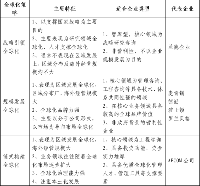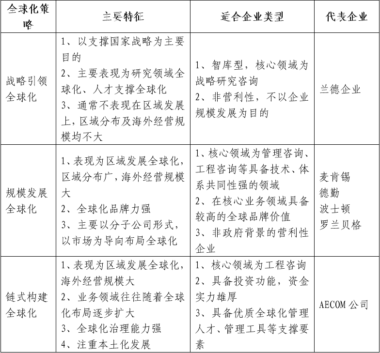 作為專業(yè)化服務(wù)行業(yè),咨詢業(yè)在技術(shù)、體系上具備通用性特征,這也是咨詢企業(yè)全球化發(fā)展的基底。縱觀全球頭部咨詢企業(yè)發(fā)展歷程,全球化戰(zhàn)略均在其發(fā)展過(guò)程中發(fā)揮了重要作用,對(duì)于企業(yè)解決階段性矛盾、擴(kuò)大經(jīng)營(yíng)規(guī)模、提升發(fā)展質(zhì)量、支撐國(guó)家戰(zhàn)略等均具有重要意義。分析對(duì)比企業(yè)全球化戰(zhàn)略實(shí)施進(jìn)程,咨詢企業(yè)主要有戰(zhàn)略引領(lǐng)全球化、規(guī)模發(fā)展全球化、鏈?zhǔn)綐?gòu)建全球化三種全球化策略。