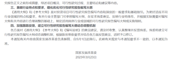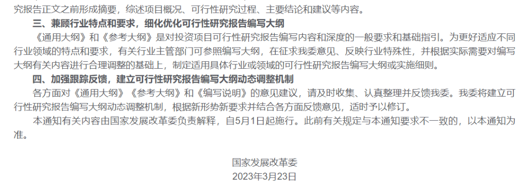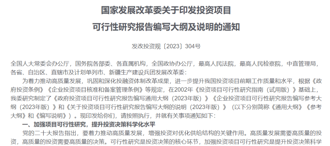 高質(zhì)量發(fā)展是中國(guó)式現(xiàn)代化的本質(zhì)要求。高質(zhì)量發(fā)展需要高質(zhì)量的投資,高質(zhì)量的投資需要高質(zhì)量的投資決策,高質(zhì)量的可行性研究是確保投資科學(xué)決策的重要基礎(chǔ)。近日,國(guó)家發(fā)展改革委出臺(tái)《關(guān)于印發(fā)投資項(xiàng)目可行性研究報(bào)告編寫大綱及說(shuō)明的通知》(發(fā)改投資規(guī)〔2023〕304號(hào),點(diǎn)擊閱讀原文),正式發(fā)布《政府投資項(xiàng)目可行性研究報(bào)告編寫通用大綱(2023版)》和《企業(yè)投資項(xiàng)目可行性研究報(bào)告編寫參考大綱(2023版)》(簡(jiǎn)稱《可研大綱》) ,這是繼《投資項(xiàng)目可行性研究指南(試用版)》(簡(jiǎn)稱《可研指南》),時(shí)隔二十年之后國(guó)家投資主管部門發(fā)布的關(guān)于規(guī)范投資項(xiàng)目可行性研究報(bào)告編寫工作的新的綱領(lǐng)性文件,對(duì)于我國(guó)新時(shí)代投資項(xiàng)目科學(xué)決策、推動(dòng)實(shí)現(xiàn)高質(zhì)量投資具有里程碑意義,標(biāo)志著我國(guó)投資項(xiàng)目可行性研究工作將邁入高質(zhì)量論證的新階段。