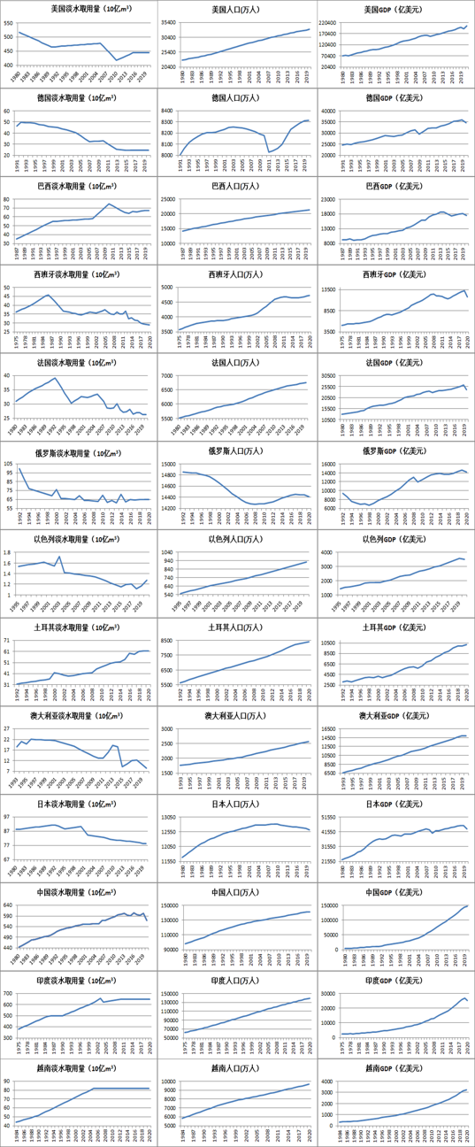 圖11 典型國(guó)家多年來(lái)生活用水與人口關(guān)系變化