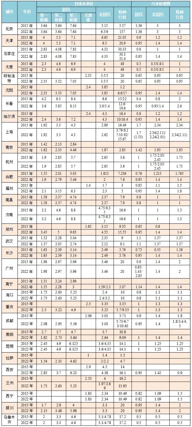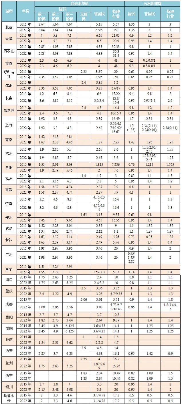 表3 2015年、2022年31個(gè)城市自來(lái)水單價(jià)和污水處理費(fèi)統(tǒng)計(jì)對(duì)比表[4]    單位:元/m3