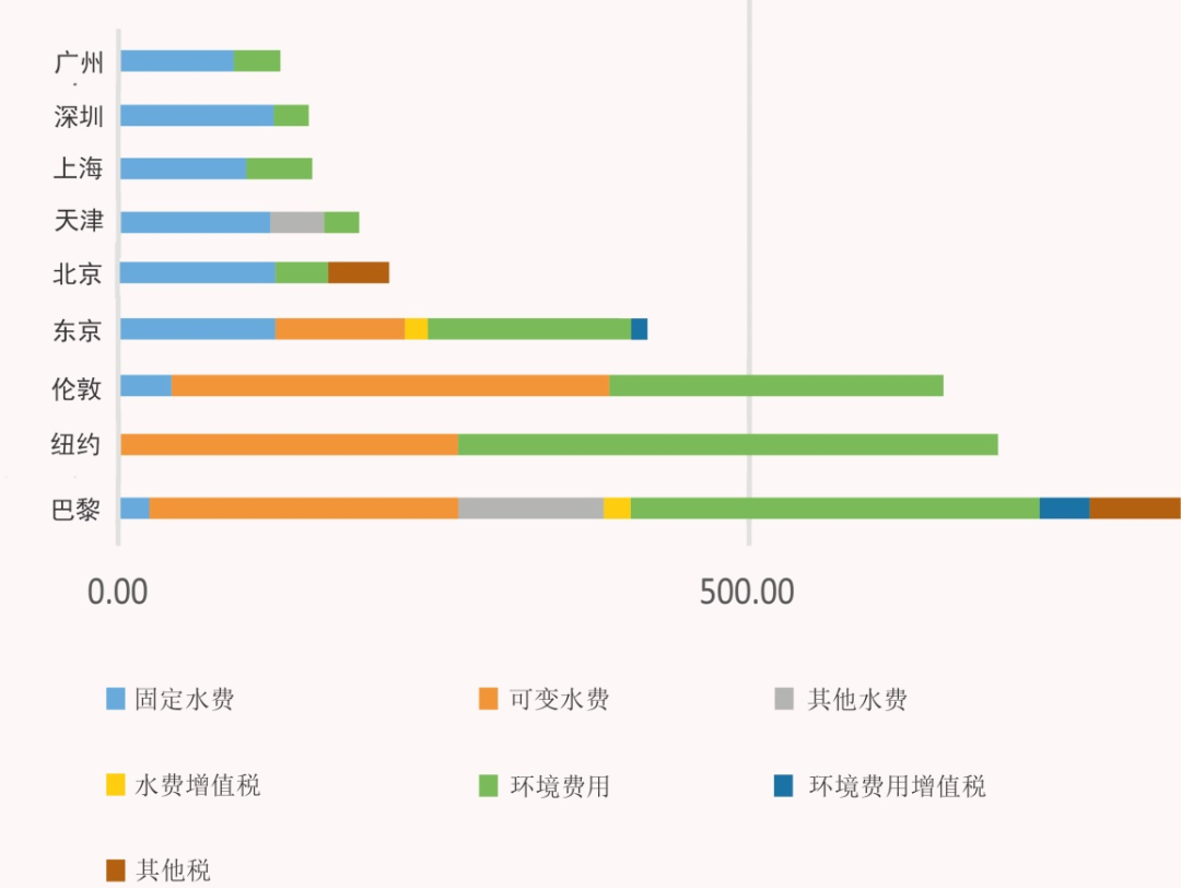 有研究提出,紐約、倫敦、東京、巴黎和新加坡家庭水費(fèi)支出占城市家庭收入的比例介于0.58%~1.10%,平均為0.76%,國(guó)內(nèi)典型城鎮(zhèn)介于0.24%~0.42%,國(guó)內(nèi)明顯低于國(guó)際。IWA Statistics and Economics組織編寫(xiě)了International Statistics for Water Services 2018并于去年10月的國(guó)際水協(xié)世界水大會(huì)上正式發(fā)布,總結(jié)了2017年39個(gè)國(guó)家198個(gè)城市水費(fèi)情況,見(jiàn)圖12。按水費(fèi)從小到大進(jìn)行排序,北京排在第33位(廣州、深圳、上海、天津排位更靠前)。選擇紐約、倫敦、東京、巴黎等國(guó)際典型城市與我國(guó)典型城市進(jìn)一步比對(duì),從水費(fèi)組成看,我國(guó)水價(jià)和排污費(fèi)均明顯偏低,見(jiàn)圖13。因此,從資源保護(hù)、環(huán)境治理、高質(zhì)量發(fā)展要求等方面看,我國(guó)水價(jià)調(diào)整勢(shì)在必行。農(nóng)業(yè)是用水大戶,加快推進(jìn)農(nóng)業(yè)水價(jià)綜合改革也是節(jié)水潛力所在。未來(lái)進(jìn)一步落實(shí)兩手發(fā)力,在價(jià)格杠桿調(diào)節(jié)供求后,提高用水效率、進(jìn)一步節(jié)水還有空間。