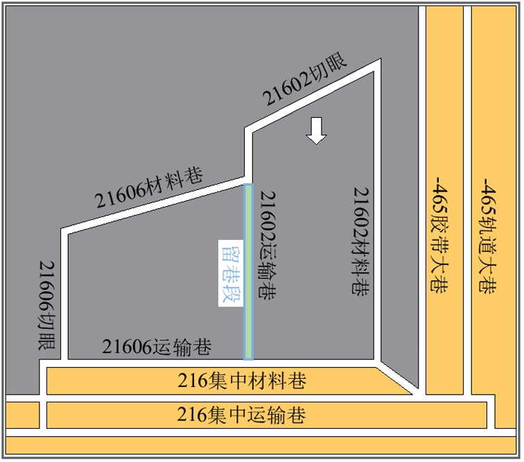 為緩解工作面采掘接替緊張,對(duì)21602工作面運(yùn)輸巷部分區(qū)段進(jìn)行沿空留巷作業(yè),將其作為21606工作面材料巷,沿空留巷區(qū)段如圖1所示。運(yùn)輸巷沿煤層頂板掘進(jìn),為半煤巖巷道,巷道斷面為矩形,凈高4m,凈寬2.6m。