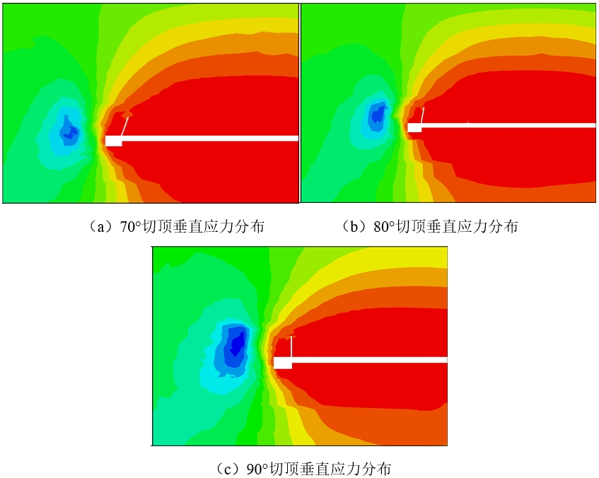 在上一節(jié)中,通過理論分析可知,最合適的切頂角度應(yīng)為70~90°,據(jù)此設(shè)計(jì)切頂角度模擬方案,即切頂角度為90°、80°和70°時(shí)進(jìn)行數(shù)值模擬,并對(duì)不同切頂角度下的應(yīng)力集中位置及峰值大小進(jìn)行對(duì)比分析,以得出最佳切頂角度,數(shù)值模擬結(jié)果如圖3所示。