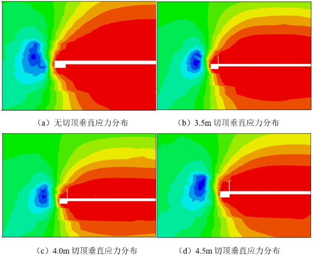 通過理論計(jì)算可知,最合適的切頂高度應(yīng)為3.4~4.5m,據(jù)此設(shè)計(jì)切頂高度模擬方案,即切頂高度為無切頂、3.5m、4m和4.5m時(shí)進(jìn)行數(shù)值模擬,并對(duì)不同切頂高度下的應(yīng)力集中位置及峰值大小進(jìn)行對(duì)比分析,以得出最佳切頂高度,數(shù)值模擬結(jié)果如圖2所示。