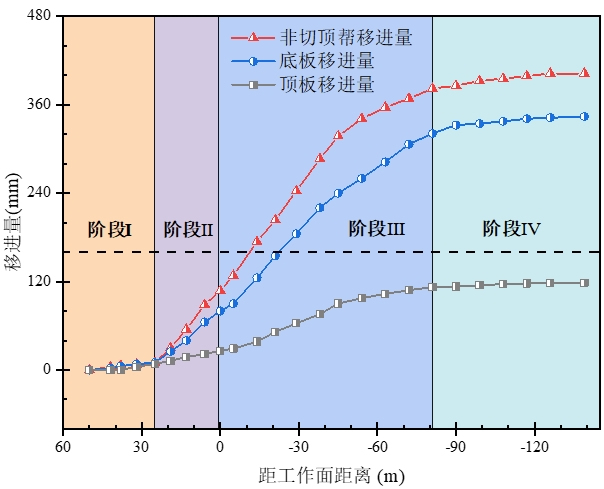 由圖9可知,沿空留巷全過程圍巖變形可劃分為四個(gè)階段(Ⅰ、Ⅱ、Ⅲ、Ⅳ)。