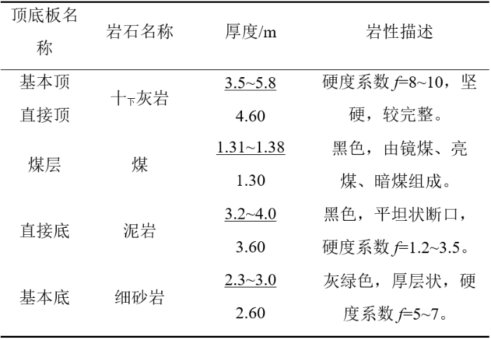 山東某礦21602工作面主采16#煤層,煤層平均厚度為1.35m,平均傾角為4°,平均埋深535m。該工作面走向長度為233m,傾斜長度為200m,采用綜合機(jī)械化開采。煤層及頂?shù)装鍘r性詳細(xì)情況見表1,直接頂和基本頂為堅(jiān)硬灰?guī)r,厚度3.5-5.8m,硬度系數(shù)f=8~10。