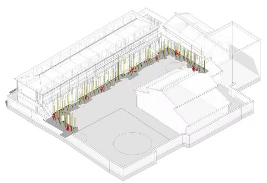 置入,是建筑設(shè)計(jì)中實(shí)現(xiàn)“空間介入”的一種慣常手法,是一種在新舊之間實(shí)現(xiàn)“相互獨(dú)立”的“整體并置”與“聯(lián)立共存”的方法,也是“極簡主義”常用的空間處置手段。新舊疊加創(chuàng)造了一種新的獨(dú)立元素,實(shí)現(xiàn)了1+1不斷接近正無窮的效果。既有建筑通過簡潔純粹的“基本形式”——竹林、竹幕、竹棚的“置入”,在形式表達(dá)上也體現(xiàn)為一種約束和理性,以體現(xiàn)對歷史的尊重,體現(xiàn)了一種具備更精致審美特征的極簡主義建筑創(chuàng)作的態(tài)度[2]