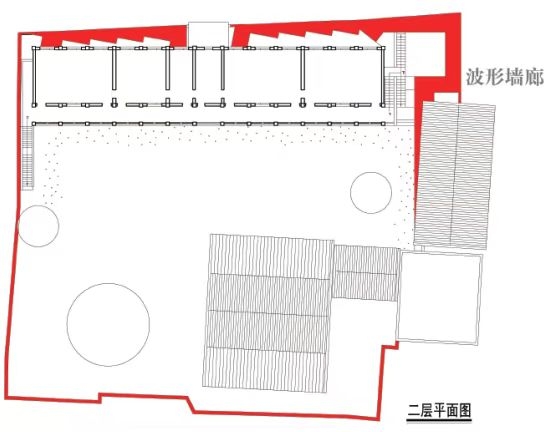 樓梯,連廊,波形廊(圖6)的運(yùn)用,不僅連接了新功能區(qū)域,還通過極簡主義的材料選擇與建構(gòu)手法,加強(qiáng)了比干廟與北側(cè)院落及建筑的聯(lián)系。這種方法所追求的整體性與極簡化的效果,受限于建筑師的能力與素養(yǎng),但也得益于施工材料、工藝與人工技能的提升,在當(dāng)代歷史性建筑的適應(yīng)性再利用中得到了強(qiáng)化。