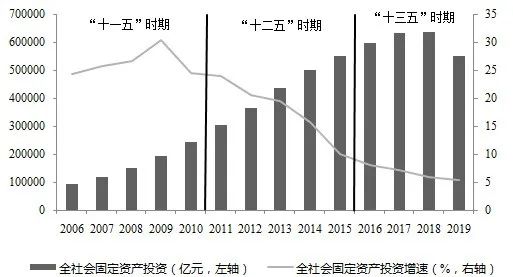 隨著我國經(jīng)濟(jì)從高速增長轉(zhuǎn)向中高速增長,拉動(dòng)經(jīng)濟(jì)增長的“三駕馬車”——投資、消費(fèi)和出口三者的貢獻(xiàn)程度也發(fā)生了變化,尤其是以消費(fèi)為主導(dǎo)的內(nèi)需逐漸成為穩(wěn)增長的重要支撐,而投資的貢獻(xiàn)有所減弱。究其原因,是因?yàn)榻陙硗顿Y增速持續(xù)回落?!笆晃濉蹦?,我國全社會(huì)固定資產(chǎn)投資(以下簡稱“全社會(huì)投資”)沖高回落,2010年增速降至30%以內(nèi)。“十二五”時(shí)期,全社會(huì)投資增速持續(xù)下行,2013年增速跌破20%?!笆濉币詠?,全社會(huì)投資增速在低位徘徊,2016年增速降至個(gè)位數(shù),2019年全社會(huì)投資只比上年增長5.1%(見圖1)。對(duì)此,國家陸續(xù)出臺(tái)了一系列穩(wěn)投資的舉措,不僅將穩(wěn)投資作為“六穩(wěn)”工作的重要方面,而且強(qiáng)調(diào)投資對(duì)優(yōu)化供給結(jié)構(gòu)發(fā)揮關(guān)鍵性作用、提升我國長期綜合競爭實(shí)力具有重要意義。