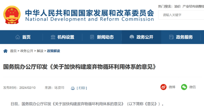 近日,國務院辦公廳印發(fā)《關于加快構建廢棄物循環(huán)利用體系的意見》(國辦發(fā)〔2024〕7號,以下簡稱《意見》)?!兑庖姟肪劢股a生活各領域的廢棄物,分類施策,明確了推進廢棄物精細管理和有效回收、提高廢棄物資源化和再利用水平、加強重點廢棄物循環(huán)利用和培育壯大資源循環(huán)利用產業(yè)的重點任務和工作要求,指向明確、操作性強?!兑庖姟返穆涞貙嵤┍貙⑼苿淤Y源節(jié)約集約高效利用,對提升廢棄物循環(huán)利用水平和協(xié)同推進降碳、減污、擴綠、增長具有重要意義。