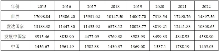 表1 世界、發(fā)展中國(guó)家、中國(guó)的境外直接投資流量(2015-2021) (單位:億美元)