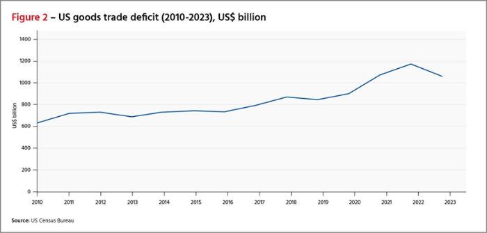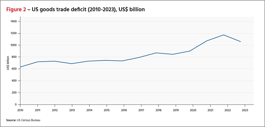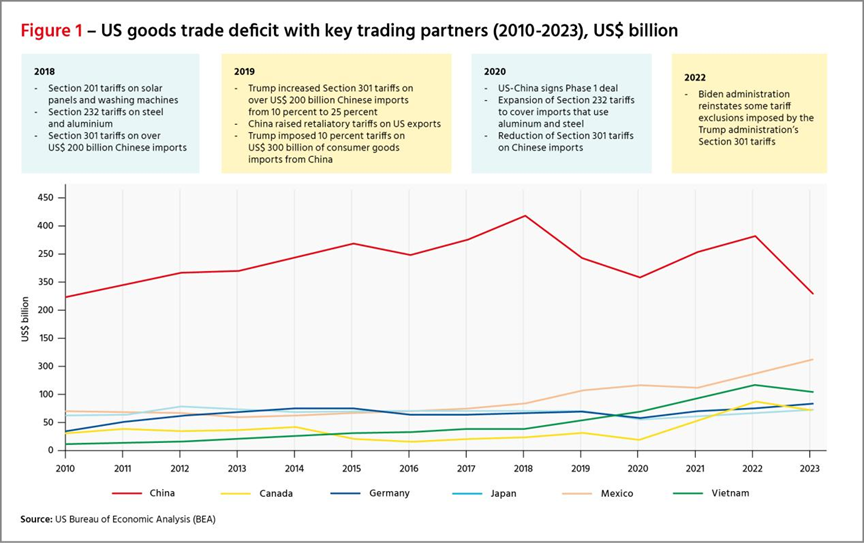 雖然拜登執(zhí)政期間大部分政策調(diào)整都得以實施,但特朗普的一項關(guān)鍵指標(biāo)被取消了。特朗普將雙邊貿(mào)易逆差的規(guī)模視為衡量美國是否從貿(mào)易中獲益的標(biāo)準(zhǔn)。與美國存在大量商品貿(mào)易逆差的國家被認(rèn)為采用了不恰當(dāng)?shù)馁Q(mào)易做法。