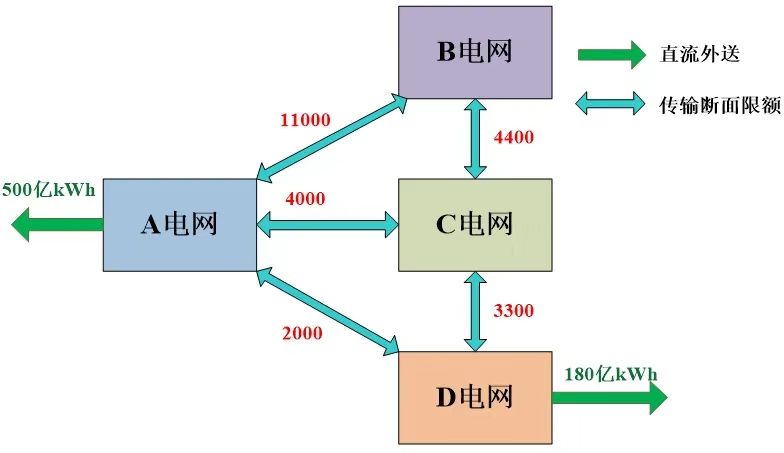為驗證所提計及源-荷匹配的新能源優(yōu)化布局方法的正確性,本節(jié)以我國北方某相鄰四個(省級)地區(qū)電網(wǎng)為測試系統(tǒng),研究2030年的新能源規(guī)劃布局問題。四個地區(qū)分布于總面積125萬平方公里范圍內(nèi),新能源滲透率達到30%以上。電網(wǎng)結(jié)構(gòu)圖如圖3所示,A、C電網(wǎng)均分別與其他電網(wǎng)相連,圖中紅色數(shù)字表示各區(qū)域間聯(lián)絡(luò)線限值(單位:MW),綠色數(shù)字為直流外送年電量(單位:億kWh)。算例計算步長為1小時,源-荷匹配周期設(shè)為1天,即24h。計算時段數(shù)8760h,其余主要算例參數(shù)見表1。本文中規(guī)劃水平年的風(fēng)電、光伏序列是基于該地區(qū)歷史出力序列進行新能源出力場景生成得到的,負(fù)荷序列是立足這些地區(qū)2021年的實際負(fù)荷需求序列,假設(shè)負(fù)荷年增長率為5%估計得到的。