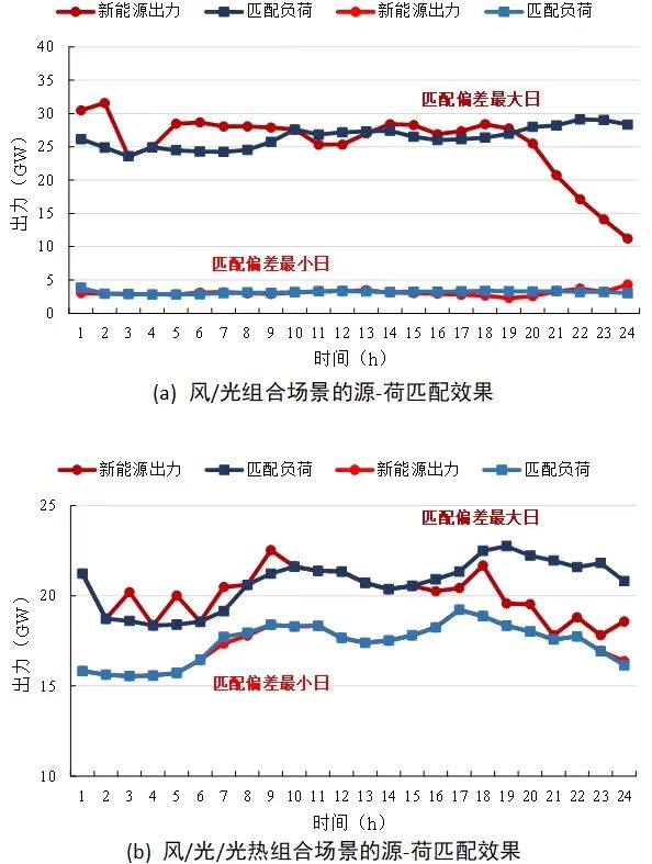 圖5所示為兩種場景下新能源出力與負(fù)荷匹配效果對比,圖中同色系深色表示匹配偏差最大日結(jié)果,淺色表示匹配偏差最小日結(jié)果。當(dāng)新能源總裝機容量一定時,從匹配效果方面看,四個地區(qū)的風(fēng)/光組合和風(fēng)/光/光熱組合均可以在一定程度上實現(xiàn)新能源總出力與負(fù)荷形狀的優(yōu)化匹配,可大幅降低電網(wǎng)的調(diào)峰難度。風(fēng)/光組合的匹配效果不及風(fēng)/光/光熱組合,這說明靈活電源的接入有利于源-荷匹配互補。從匹配偏差方面看,風(fēng)/光組合匹配偏差最小日的新能源出力非常低,說明僅靠風(fēng)電和光伏很難完全匹配負(fù)荷波動。風(fēng)/光/光熱組合匹配偏差最小日的新能源出力有所提高,光熱接入后,新能源出力與負(fù)荷匹配偏差更小,最優(yōu)可達到匹配偏差為0的效果,即使是全年匹配偏差最大日,最大新能源功率缺額也未超過5GW,也驗證了靈活性新能源電源CSP電站可有效提升新能源出力互補能力。