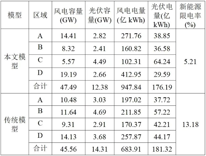 可以看出,對比傳統(tǒng)方法,考慮源-荷匹配后,本文模型所得D地區(qū)風(fēng)電和C地區(qū)光伏最優(yōu)布局容量分別增長了35.81%和54.3%。從風(fēng)電和光伏總裝機方面看,本文模型所得風(fēng)電總?cè)萘枯^傳統(tǒng)方法高4.24%,這表明考慮源-荷匹配后,系統(tǒng)更傾向于配置互補性更好的風(fēng)電,光伏由于出力形狀較為固定,容量越大越難以實現(xiàn)源-荷匹配。此外,在新能源總裝機一致的情況下,本文模型得到的新能源年度總出力電量為1124.03億kWh,而傳統(tǒng)模型所得新能源年度總出力電量為865.23億kWh,前者相較后者提升29.91%,即考慮源-荷匹配可使新能源滲透率從28.51%增加至37.04%。從新能源限電方面看,考慮源-荷匹配可使新能源總限電率從傳統(tǒng)模型的23.18%降低至本文模型的5.21%??梢钥闯?,在同樣的裝機總?cè)萘肯拢紤]源-荷匹配可以充分提升新能源消納能力,減少棄風(fēng)、棄光情況。